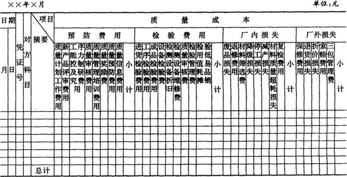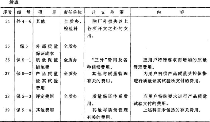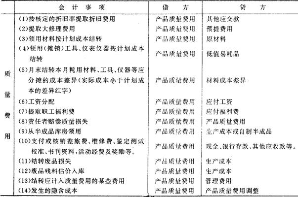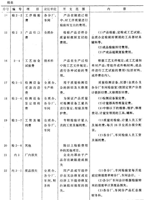 十、帐户设置及帐务处理。为了核算产品质量成本,设置“产品质量费用”总帐帐户,归集属于质量管理的各项费用和损失,包括显见成本和隐含成本。“产品质量费用”总帐帐户下设“预防费用”、“检验费用”、“厂内损失”、“厂外损失”、“外部质量保证成本”,以及“产品质量费用调整”六个二级帐户。“产品质量费用调整“帐户用于调整实际没有支付,但应计入其他二级帐户的隐含成本,以保证“产品质量费用”帐户借方发生额完整地反映企业发生的质量成本,据以编制“质量成本报表”。 各二级帐户下设若干按产品分别设置成本项目专栏的三级明细帐户。将直接费用按产品别进行明细核算;间接费用在产品之间进行分配,以便更加具体地反映各项质量成本的发生情况。 附表17《产品质量费用会计科目使用说明》 附表17 产品质量费用会计科目使用说明