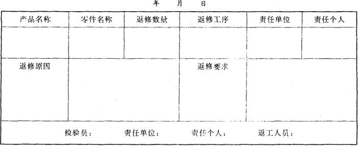 废品损失应计算材料和人工损失,并扣除可回收利用的残值及责任者的赔偿,按下列办法确定废品的净损失: 材料损失=单位产品定额材料消耗量×废品数量 人工损失=累计产品废品工时×计划小时工资率 2.返修通知单和返修损失计算汇总表 《返修通知单》是对可修复废品进行返工修复的原始凭证,由操作者自行返修的,也应在工时记录中予以统计反映。 月末,有关质量成本核算人员,根据汇总的返修通知单,编制《返修损失计算汇总表》,计算返修损失。返修损失的计算方法与废品损失的计算一致,返修工时一般按实际消耗统计。 附表4《返修通知单》 附表4 返修通知单