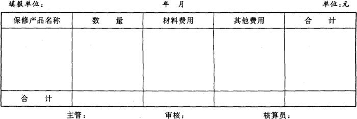8.保修费用报告单和退换损失报告单 企业技术服务中心和企业销售部门根据出厂产品,保修实际消耗的材料费用及其他有关费用的原始凭证,按月填报《保修费用报告单》。 企业技术服务中心和企业销售部门根据当月实际发生的退换产品损失金额,于月末额报《退换损失报告单》送公司财会部门审核。 附表11《保修费用报告单》 附表11 保修费用报告单