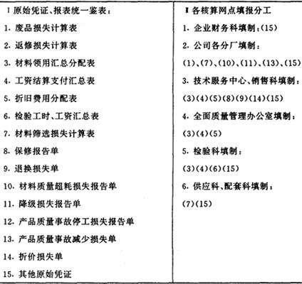 Ⅱ.质量成本的开支范围 五、质量成本的开支范围有以下几方面: (1)开展全面质量管理活动所耗用的材料、辅助材料、办公费、差旅费和劳动保护费。 (2)用于对材料、半成品、产成品、外购件进行质量检验的仪器仪表、工量具的购置费与折旧费。 (3)产品、半成品及外购件试验、评审费。 (4)质量管理人员工资、福利费及奖金。 (5)用于质量管理先进单位和个人的奖励支出,QC小组活动经费。 (6)产品出厂前由于质量缺陷造成的材料损失、人工损失等。 (7)包修、包换、包退费用及各种赔偿费用。 (8)其他与质量管理有关的费用。 凡是属于质量成本核算范围以内的各种费用和损失,都要按既定的核算程序在会计核算中得到反映,不得任意扩大或缩小开支范围。 Ⅲ.划清几个费用界限 六、首先,划清质量成本中显见成本与隐含成本的界限。根据现行会计制度的规定,显见成本一般在帐户反映,隐含成本尚未在会计核算中反映。因此,需要单独进行反映和调整。 其次,划清质量成本中应计入产品成本和不应计入产品成本的界限。虽然企业的财务收支极其错综复杂,但资金来源与运用必须纳入规定的渠道,企业不同的费用开支有不同的资金来源,不能把不属于产品成本开支范围的质量费用挤入产品成本,否则会混淆耗费与补偿的界限。 第三、划清各种产品质量成本之间的费用界限,以及完工产品和月末在产品之间的质量成本界限。为了简化,月末在产品成本可不计算质量成本。 第三部分 质量成本核算 七、正确地核算产品质量成本是实施责任会计的中心环节,是编制质量成本报表,实行质量成本控制,反映质量成本计划执行情况,并为企业经营决策提供质量经济信息的主要依据。质量成本核算先由各核算网点进行,由企业财会部门统一核算。通过会计核算连续地、系统地反映和监督企业有关质量管理活动的全过程,从而建立起适应企业内部经营管理需要并和现行财务成本制度相结合的质量成本核算体系。 八、质量成本数据的收集。质量成本数据来源大都是属于现行成本核算的数据。为准确计算质量成本,需要将某些现行成本核算数据进一步细化。所以必须从原始记录和原始凭证开始,归集质量成本数据,并按收集的内容、程序和统计进行汇总。 九、质量成本数据一般来源于下列资料: 1.废品通知单和废品损失计算汇总表 废品通知单是产品或零件报废的原始凭证。检验员根据规定的质量标准,对产品或零件的质量做出判断,发现不可修复的废品,填制废品通知单。月末,质量成本核算人员根据审核无误的废品通知单,编制《废品损失计算汇总表》。 附表(二)《废品损失计算表》。 附表2 废品损失计算表