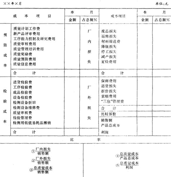 第一部分 总则 一、质量成本管理是企业动员与质量有关的部门和职工对质量成本进行预测、计划、核算、分析、控制和考核等环节所进行的一系列的组织与活动。开展质量成本管理,有助于提高产品质量.降低消耗、求得质量、成本、效益三者最佳配合。用最经济的手段、生产出用户满意的产品,寻求质量与成本统一的最佳质量水平,达到经济效益与社会效益的统一。 质量成本指标在产品质量的产品责任、防止公害、节约资源、降低成本、加强服务、提高效益等多目标的综合评价中具有重要的地位和作用。 第二部分 质量成本的内容 二、质量成本是质量经济性的一部分,企业为确保和保证满意的质量时所发生的费用,以及因未达到既定质量标准而发生的损失的总和。它是保证产品质量而发生的支出,形成一个独立的成本形态,构成产品成本的一部分内容。 Ⅰ、质量成本的分类和项目的设置 三、从产品质量形成过程分为:产品设计工艺质量成本;材料能源采购质量成本;生产制造质量成本;销售服务质量成本。从质量成本发生的性质可分为:预防成本;检验成本;厂内损失、厂外损失;外部质量保证成本五类及其各明细项目。从控制质量成本的角度,可以把预防成本、检验成本划为可控制成本;把厂内损失、厂外损失划为结果成本。从质量成本的价值补偿角度,可以划分为显见成本和隐含成本。前者是实际支付必须从价值上得到补偿的费用;后者是不必支付但应计算的损失,包括质量事故的减产损失、停工损失、降级损失、折价损失等四种。 四、根据以上质量成本的分类及我厂实际情况。 质量成本的项目设预防成本、检验成本、厂内损失、厂外损失、外部质量保证成本,在每项下面再设置若干项目。 附表1《质量成本项目及其内容》 附表1 质量成本项目及其内容