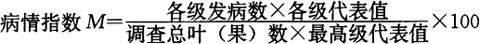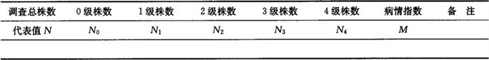1.4 树脂病分级标准 ◆0级:全株无感病枝条和叶片; ◆1级:感病枝条和叶片少于10%,无枯死枝条,主干无明显症状; ◆2级:感病枝条和叶片在10%~30%之间,少见枝条干枯,主干可看出明显症状; ◆3级:感病枝条和叶片在30%~60%之间,有较多枝条枯死,主干和主枝皮层剥落严重,个别枯死; ◆4级:感病枝条和叶片在60%以上,一半以上主枝死亡,主干枯死半周以上。 1.5 计算方法 表7-67中:总株数N=N0+N1+N2+N3+N4