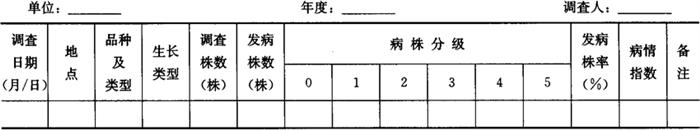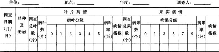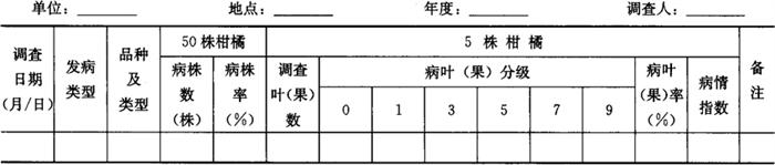 1.3.2 病情普查 掌握春、夏、秋梢叶在萌发后60天(或叶片革质化)、果实下部转黄时各调查1次。按病情程度选择轻、中、重三类型主栽品种橘园各5个以上。每个橘园查50株的株发病率、叶发病率或果实发病率。叶或果实最后1次调查时,增加病情指数考查。调查结果记载于表7-66。 表7-66 橘园溃疡病普查表