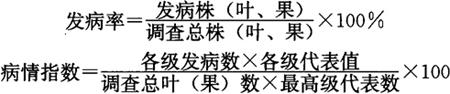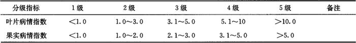 1.3.3 成年结果树溃疡病分级(以叶、果为单位) ◆0级:果上无病斑; ◆1级:每叶(果)上有病斑1~5个; ◆3级:每叶(果)上有病斑6~10个; ◆5级:每叶(果)上有病斑11~15个; ◆7级:每叶(果)上有病斑16~20个; ◆9级:每叶(果)上有病斑21个及以上。 2 预测预报方法 在有初次侵染来源存在的情况下,以品种的感病性,新梢抽放期、抽放次数和数量、整齐度情况,新梢1.6cm至幼果横径9~30mm(落花后30~60天)期间的气象预报作为本病预测预报的依据。 旬平均气温达15℃以上,相对湿度在60%以上,新梢即可受侵,加上20天左右的潜育期,即为春梢期溃疡病的始发期。 春、夏、秋梢旬平均气温达20~30℃,相对湿度在80%以上,旬雨量20~200mm,又与新梢和幼果的易侵入期相吻合,则可能严重发生(温度20~30℃,潜育期为3~10天)。落花后30~60天,如遇上述气象条件,则果实发病严重。 春梢前期和秋梢后期,除雨、湿条件外,主要受温度条件制约。春季温度回升慢,则始发期迟;秋季低温、干旱来得早,则提早停止发病。 在同等条件下,幼龄果树发病重,老龄果树发病轻。 3 发生程度分级 根据最后1次叶片和果实病情普查结果判别为害程度。当各项指标分级不一致时,按较高级判定。为害程度分级标准如下。 发病率、病情指数按下式计算: