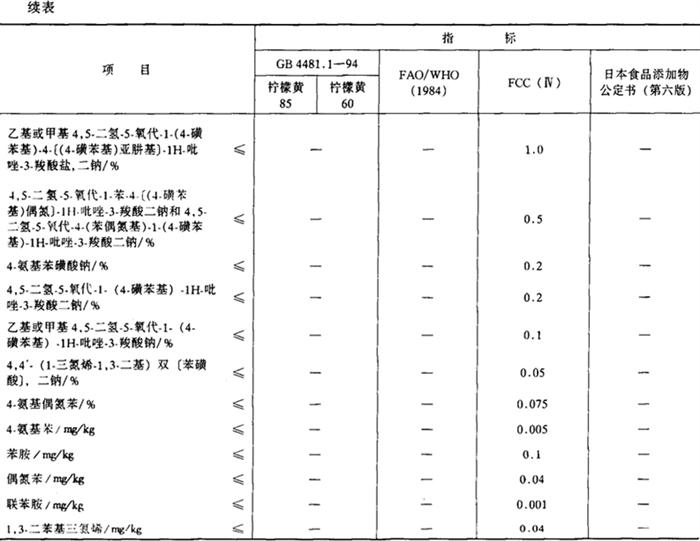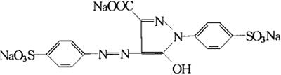 | 释义 | 柠檬黄 别名 酒石黄、3-羧基-5-羟基-1-(4′-磺基苯基)-4-(4′-磺基苯偶氮)-邻氮茂三钠盐、C.I.食用黄色4号、FD&C黄色5号(美)、食用黄色5号(日) 编码 GB 08.005,INS 102;C.I.(1975)19140 化学结构