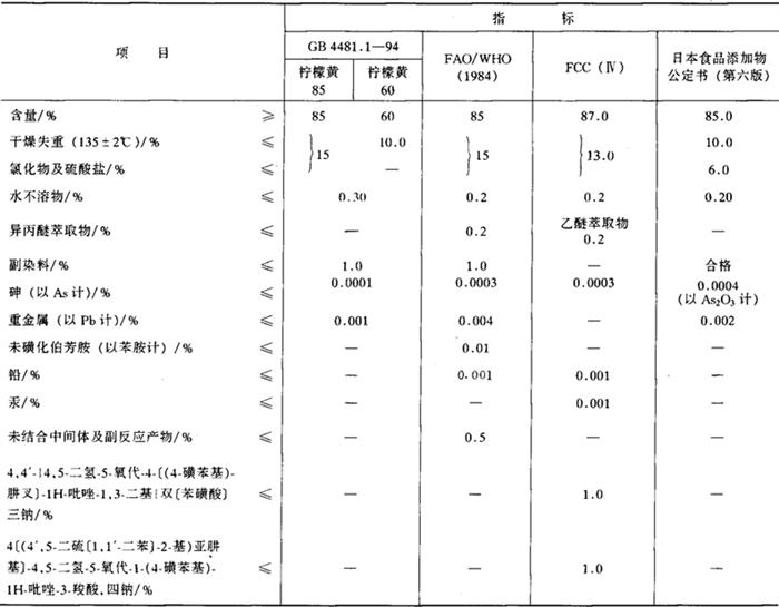 C16H9N4Na3O9S2 相对分子质量 534.37 性状 橙黄至橙色均匀粉末或颗粒,无臭。易溶于水(1g/10mL,室温)、甘油、乙二醇,微溶于乙醇、油脂。耐光、耐热(105℃)性强。在柠檬酸、酒石酸中稳定。水溶液为黄色,遇碱稍变红,还原时退色。 制法 (1)苯肼对磺酸与双羟基酒石酸钠缩合。 (2)对氨基苯磺酸重氮化后与羟基吡唑酮偶合。 质量标准