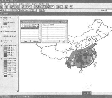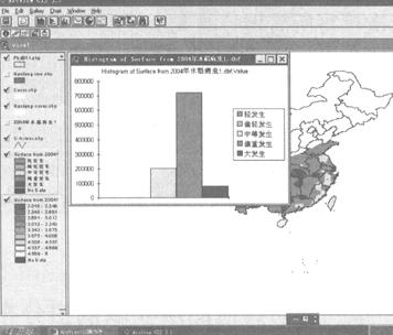 图11-55 示重新划分等级功能查询病虫分布信息 需要注意的是:要在某一病虫面状分布图中查询信息,首先必须对之进行选择,使其处于活动状态,否则操作无法进行。 2 借助其他图层获取病虫分布的有关图形信息 2.1 利用区域统计(Zonal Statistic)功能获取病虫分布信息 例如,已经绘制的2004年稻飞虱发生趋势分布图,想知道各省的发生程度的平均值情况,则可以借助于省界数字化地图,利用ArcView GIS空间分析模块提供的区域统计(Zonal Statistic)功能进行相关处理将之算出并以柱状图表示。 在视图窗口选择省界数字化地图Pbd911.shp,打开其属性表并选择所要了解省份的纪录,点击回到视图窗口,从界面分析(Analysis)下拉菜单选择区域统计(Zonal Statistic)命令,在出现的区域汇总(Summarize Zones)对话框中选择用于定义区域名称的字段(一般选择包含地名的字段,如包含省名的Prov_ch),点击确认键后再在对话框图层列表选择所需要的含有汇总所用变量的病虫面状分布图,如“Surface from 2004年水稻病虫1.dbf”,屏幕上将出现一个名称为“Stats of Surface from 2004年水稻病虫1.dbf Within Zones of Pbd911.shp”的汇总表和制作柱状图统计量选择(Select statistic to chart)的区域汇总对话框,见图11-56。
