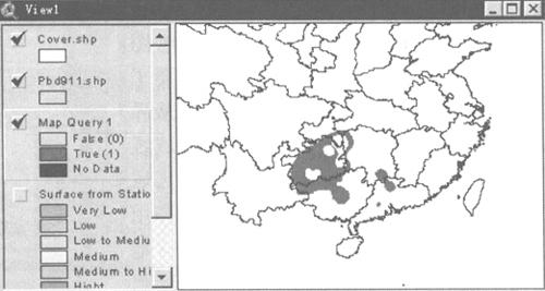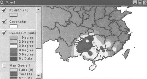 图11-54 示地图查询(Map Query)功能查询病虫信息 1.4 利用重新划分等级(Reclassify)功能查询 假设要将已绘制好的稻飞虱观测区虫口密度分布图根据密度的大小划分成5个不同的级别。一级百丛虫口密度小于500头,标注为1 Degree,在地图上以绿色显示其分布区域;二级为500~1000头,标注为2 Degree,以浅蓝色显示其分布区域;三级为1000~2000头,标注为3 Degree,以黄色显示其分布区域;四级为2000~4000头,标注为4 Degree,以粉红色显示其分布区域;五级为4000~6000头,标注为5 Degree,以红色显示其分布区域。运用重新划分等级功能可非常方便地绘制出新的满足要求的分布图。 选择图层Surface from Station.dbf使之处于活动状态,从界面分析(Analysis)下拉菜单选择重新划分等级(Reclassify)功能,在出现的分级(Classification)对话框级数(Number of Classes)下拉菜单栏选择5并点击确认键,屏幕将出现重新定义分类数值(Reclassify Values)对话框,在新的数值(New Values)栏依次填写所需划分的5个级别的数值范围,填写完毕点击确认键,一个按照给定划分等级名称为Reclass of Surface from Station.dbf的图层被添加到视图窗口的图层目录列表中。双击其名称打开图例编辑器,改变其填充颜色和标注,并使其显示在视图窗口,通过调整图层目录列表顺序,来调整各层在视图窗口的摆放层次,即可得出满足条件的新的病虫面状分布图(图11-55),较为清晰地显示了各地发生程度。