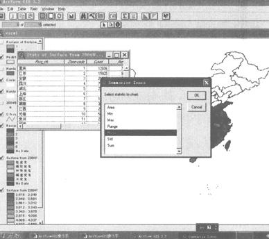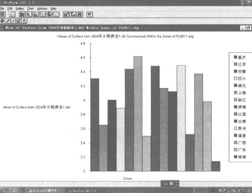 图11-56 示区域统计生成的表格和区域汇总对话框 在对话框中选择平均值(Mean)作为制作柱状图的统计量,点击确认键,一个名为“Mean of Surface from2004年水稻病虫1.dbf Summarized Within Zones of Pbd911.shp”的窗口出现在屏幕上,其内显示了选择省份稻飞虱平均发生级别的柱状图,见图11-57。通过该柱状图,可以看出各省的发生级别。如要了解汇总(Sum)、最大值(Max)、最小值(Min)、标准差(Std)、范围(Range)等信息,选择相关制作柱状图的统计量,即可得到相应的柱状图。