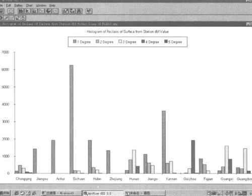 图11-57 示运用区域统计功能获取病虫信息柱状图 通过例子可以看出,运用区域统计功能需要两个图层:一个是用于提供汇总统计数值的平面栅格图层;另一个是用于鉴别平面栅格图各组成单元所在区域的多边形图层。 2.2 运用区域柱状图(Histogram by Zones)功能获取病虫分布信息 如前所述,通过重新分类我们获得了稻飞虱发生级别面状分布图,现在想知道一些省份各种级别的分布情况,借助于省界数字化地图,运用ArcView GIS提供的区域柱状图功能,就可以获取这一信息并以柱状图表达。 在视图窗口选择省界数字化地图Pbd911.shp,打开其属性表并选择所需要省份的纪录,点击回到视图窗口,从界面分析(Analysis)下拉菜单选择区域统计(Histogram by Zones)选项,在出现的区域柱状图(Histogram within Zones)对话框中选择用于定义区域名称的字段(一般选择包含地名的字段,如包含省名的Prov_nm),点击确认键后再在对话框图层列表选择所需要的含有汇总所用变量的图层名称(如Reclass of Surface from Station.dbf)并点击确认键,屏幕上将出现一个名称为“Histogram of Reclass of Surface from Station.dbf Within Zone of Pbd911.shp”的窗口,其内显示了我们所需了解信息的柱状图,见图11-58。