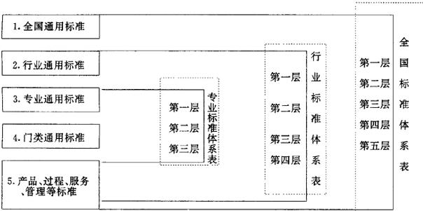 | 释义 | 标准体系及标准体系表 1.标准和标准体系的关系 标准是对重复性事物和概念所做的统一规定。标准体系是指一定范围内的标准按其内在联系形成的科学有机整体。标准体系的范围可以是一个国家、一个部门、一个专业或一个企业等。在此范围内包含的全部标准互相依存、衔接、补充、制约并以一定比例的数量关系组成一个有机整体。 2.标准体系表与标准体系的关系 一定范围的标准体系内的标准按一定形式排列起来的图表称为标准体系表。 标准体系表是标准体系的核心。标准体系表表示组成标准体系的各项标准间的相互关系,其组成的单元是各个具体标准。 标准体系表是一种指导性技术文件,是编制标准、修订规划和计划的依据之一;是促进一定标准化工作范围内的标准组成达到科学合理化的基础;是包括现有应用和预计发展的标准的全面蓝图;编制标准体系表是编制标准化长远规划的一项基础性科研工作。 标准体系表随着科技、生产发展不断调整、充实与完善,其更新期比一般标准短,只有经过不断的修订,才能保持标准体系表的生命力延续不衰。 3.编制标准体系表的作用 (1)弄清标准的需要数量: (2)便于分析和确定标准化规划的重点和重点项目; (3)从标准体系表中容易找出标准构成上的薄弱环节; (4)标准体系表还可以通过与国际标准、国外先进标准项目的具体对比,为编制采用国际标准的规划提供了比较准确的依据; (5)便于各部门组织协调与配套。 4.标准体系表的结构(图1.3.2-1)