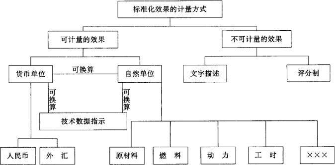 | 释义 | 标准化经济效果评价指标的计量方式 关于标准化经济效果的计量方式应以货币单位或自然单位的定量评价为主,以文字或图表描述的定性评价为辅。标准化经济效果的定量评价有两种方式,即货币单位和自然单位(kg、kW、m、h等)。由于经济现象的复杂性,有些标准化的经济效果不能用定量数值表示,或者用数值定量表示很费力、很不确切。这就是说,标准化的经济效果并不都是可以用具体数字表达出来的,此时,可以用文字或图表描述,作为定量评价的补充。如提高安全性、改善劳动条件,提高环境质量,增强国防能力,提高出口竞争能力,有利于采用新技术和专业化生产,缩短生产周期,加速流动资金的周转。有关名词术语、符号代号及其他便于互相了解的事物,则可用文字描述;为了阐明标准化的效果与其他技术措施效果的关系,以及某项标准化工作的效果的延伸或扩展时,也可用文字来描述。 国际标准化组织标准化原理委员会和日本等,对一些难以用数值来表达的效果,曾建议采用评分制。 综上所述,标准化的经济效果实际上存在4种表达方式,即:货币单位、自然单位、文字描述、评分制(图9.2.1-1)。在一般情况下,应以用数值表达的货币单位的评价为主,以文字描述为辅,这种关系不能倒置。但是,有的时候,用文字描述进行评价也是不可忽视的,这样,才能使标准化经济效果的评价,更加全面、确切。