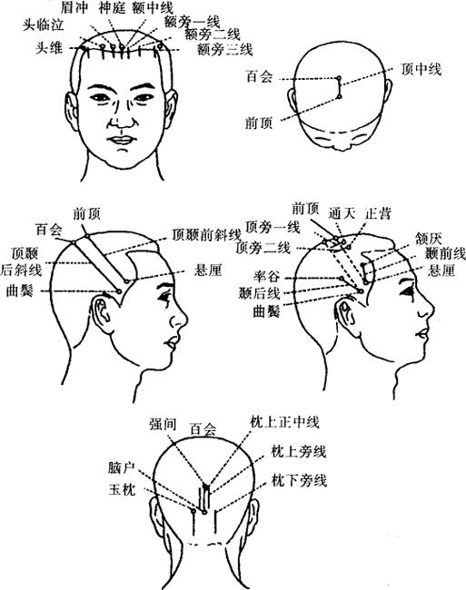 | 释义 | 标准头穴的定位与主治 按《中国头皮针施术部位标准化方案》,头皮针施术部位是按区定穴,联穴划线,以线归经。分额区、顶区、颞区、枕区4个区,现将14条头皮针刺激线的定位和主治介绍如下: 1.额中线 在额部正中,属督脉。自神庭穴向前,透过前发际,沿皮刺1寸。主治神志病和鼻病等。 2.额旁1线 在额中线外侧,直对目内眦,属足太阳膀胱经。自眉冲穴向前,透过前发际,沿皮刺1寸。主治胸部疾病和鼻病等。 3.额旁2线 在额旁1线的外侧,直对瞳孔,属足少阳胆经。自头临泣穴向前,透过前发际,沿皮刺1寸。主治腹部疾病和眼病等。 4.额旁3线 在额旁2线的外侧,直对目外眦,属足少阳胆经和足阳明胃经。自头维穴内侧0.75寸处,向前透过前发际,沿皮刺1寸。主治功能性子宫出血、阳痿、早泄、子宫脱垂、眼病等。 5.顶中线 在顶部正中,属督脉。自前顶穴向百会穴,沿皮刺1.5寸。主治腰腿足瘫痪、麻木和疼痛等。 6.顶颞前斜线 在头部侧面,自前顶穴沿皮刺向颞部的厘穴,贯穿督脉、足太阳膀胱经和足少阳胆经。自上而下,分别主治下肢、上肢及面部瘫痪等。 7.顶颞后斜线 在头部侧面,自百会穴沿皮刺向颞部的曲鬓穴,贯穿督脉、足太阳膀胱经和足少阳胆经。自上而下,分别主治下肢、上肢及头面部感觉异常等。 8.顶旁1线 在顶中线旁开1.5寸,属足太阳膀胱经。自通天穴沿皮向后刺1.5寸。主治腰腿瘫痪、麻木和疼痛等。 9.顶旁2线 在顶旁1线的外侧,顶中线旁开2.25寸处,属足少阳胆经。自正营穴沿皮向后刺1.5寸。主治肩臂手瘫痪、麻木和疼痛等。 10.颞前线 在颞部鬓角内,属足少阳胆经。自颌厌穴向下,沿皮刺向悬厘穴。主治偏头痛、运动性失语、周围性面神经麻痹等。 11.颞后线 在颞部耳上方,属足少阳胆经。自率谷穴向前下方,沿皮刺向曲鬓穴。主治偏头痛、耳鸣、耳聋、眩晕等。 12.枕上正中线 为枕外粗隆上方正中的垂下线,属督脉。自强间穴向下,沿皮刺1.5寸,达脑户穴。主治眼病等。 13.枕上旁线 与枕上正中线平行往外0.5寸,属足太阳膀胱经。主治皮层性视力障碍、白内障和近视眼等。 14.枕下旁线 为枕外粗隆两侧向下的垂直线,属足太阳膀胱经。自玉枕穴向下,沿皮刺2寸。主治小脑疾病引起的平衡障碍、后头痛等。(见图2-26)