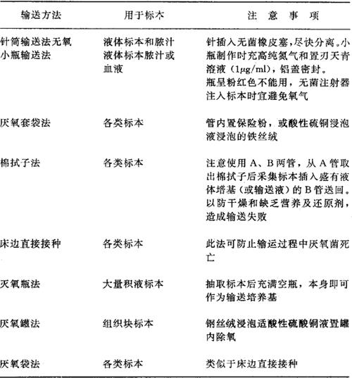 上述各法注意:1.无氧输送;2.常温输送(低温下厌氧菌如B.fragilis易死亡);3.混合气体中(80%N2、10%CO2、10%H2)输送最好,单纯CO2中易抑制产气荚膜梭菌和消化链球菌生长;4.避免标本干燥等