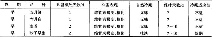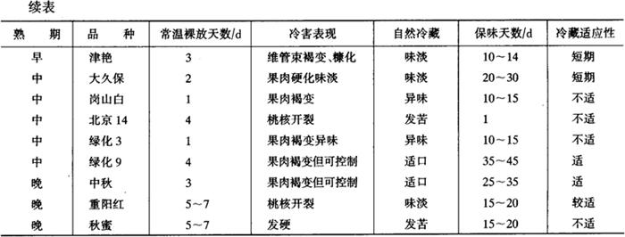 | 释义 | 桃、李、杏采后生理及贮藏特性 桃果采收后果实组织中果胶酶、纤维素酶、淀粉酶活性很强,这是桃果实采后在常温下很易变软、品质败坏的主要原因。特别是水蜜桃采后呼吸强度迅速提高,比苹果强1~2倍,在常温条件下1~2d就变软,低温及低氧或高二氧化碳可抑制这些酶的活性,因此采后的果实应立即降温及进入气调状态,以保持其硬度和品质。桃对温度的反应比其他果实都敏感,采后桃在低温条件下呼吸强度被强烈地抑制,但易发生冷害。桃的冰点温度为-1.5℃,长期0℃下易发生冷害。冷害发生早晚及程度与温度有关,据研究表明,桃在7℃下有时会发生冷害,3~4℃冷害发生是高峰,近0℃反而小。冷害的桃果实细胞壁加厚、果实糠化、风味淡、果肉硬化,果肉或维管束褐变,桃核开裂,有的品种发苦或产生异味,但不同的品种其冷害症状不同(如表7-8)。 李、杏等核果类果实采后生理特性与桃相似。 表7-8 几种桃的冷害症状