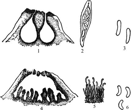 图3-4 桃树腐烂病菌 1.子囊壳 2.子囊 3.子囊孢子 4.分生孢子器 5.分生孢子梗及分生孢子 6.分生孢子 病菌发育温度5~37℃,最适温度为28~32℃。孢子萌发温度为8~33℃,最适温度18~23℃。 【发病规律】: 病菌以菌丝体、子囊壳及分生孢子器在树干病组织中越冬。第二年3~4月份,分生孢子器吸水后分生孢子从孔口挤出,经雨水溶解后,借风、雨和昆虫传播,从伤口或皮孔侵入,冻害造成的伤口是病菌侵入的主要途径。侵入后,以菌丝在树皮与木质部之间发展,消解细胞间的中胶层,并分泌毒素杀死附近细胞,树皮受病菌刺激后,于形成层及内皮层之间,形成大量的胶质孔隙。当胶孔联合、胶质增多、树皮裂开时,发生流胶现象。菌丝不但侵入皮层,而且能深达木质部。分生孢子器多产生在被害枝梢上,而子囊壳多产生在被害大枝和树干上。分生孢子发生时间较子囊孢子早1个月左右。 病害在春秋两季发展较快,秋末11月进入休眠状态,次年3~4月又开始活动,5~6月进入病害发生高峰期。高温时,病害发展受到抑制。凡削弱树势、造成伤口的种种因素,都能加重病害的发生,冻害往往是导致病害大发生的重要因素。冬季寒冷,春季温度突然升高,并且天气潮湿以及土壤黏重,缺乏有机肥或病虫害严重,都有利于病害严重发生。凡与蔬菜或秋季需肥水较多的作物间作,桃树腐烂病发生严重,与豆科作物间作,发病较轻。施肥量过多或时期过晚均能诱发病害。地势高、排水好、土壤砂质的桃园发病较轻;地势低洼、土壤黏重的桃园发病较重。 【防治方法】: 根据桃树腐烂病在树势衰弱时最易感病的特点,以培养树势为基础,同时注意防冻,及时防治为害枝干和树皮的害虫;密切注视病害的发生发展,及时治疗,控制病害蔓延扩展。具体措施参考苹果树腐烂病的防治方法,但桃树与苹果树不同,生长季节造成的伤口不仅很难愈合,而且极易引起流胶,所以对发病部位刮治后,必须外涂伤口保护剂。 |
