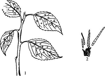 图9-25 梅花褐斑病 1.症状 2.分生孢子 【病原】 为核果尾孢属的Cercospora circumscissa Sacc.。分生孢子梗10~16根成束着生,榄褐色,有隔膜1~3个。分生孢子鞭形,榄褐色,直形或微弯,3~12个分隔,大小为30~115微米×2.5~5微米。有性态为Mycosphaerella cerasella Abezhold,属子囊菌亚门,腔菌纲,座囊菌目。子囊壳生于落叶上,球形或扁球形,直径72微米。子囊圆筒形或棍棒形,35.4微米×7.6微米。子囊孢子纺锤形,15.3微米×3.1微米。 【发病规律】 以菌丝体在枝梢病组织内越冬,或以子囊壳在落叶上越冬。次年春产生分生孢子行初次侵染,或子囊孢子萌发侵染。一般6月开始发病,8~9月发病重。雨水多,树势弱,对病害发生有利。 【防治方法】 加强管理。冬季结合修剪,清除重病枝,清扫落叶,集中烧毁,减少越冬菌原。冬季或早春在植株发芽前,喷波美2~4度石灰硫磺合剂。 |
