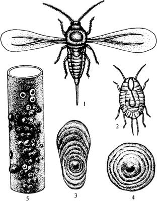 图8-20 梨圆蚧 1.雄成虫 2.若虫 3.雄虫介壳 4.雌虫介壳 5.被害状 【发生规律】 每年发生代数,不仅因温度而异,就是在同一地区内寄生在不同种类的花卉上,其生活史也有差异。在青岛1年发生3代。多以2龄若虫和少数受精雌成虫在枝干上越冬。翌年5月上中旬发生第一代若虫,在枝叶上吮吸为害。第二代和第三代若虫发生期分别为7月上旬和9月上旬。11月下旬开始越冬。夏季型雌虫介壳灰色,雄虫介壳椭圆形;冬季型雌虫介壳黑色,雄虫介壳圆形。雌若虫蜕皮3次,雄若虫蜕皮2次。 【防治方法】 (1)植物检疫。此虫为国际检疫对象之一,因而向国外引种时,必须加强植物检疫工作。国内严禁到疫区引种。 (2)园艺防治。选择地势高燥、排水良好、土壤肥沃的场地种植。综合整枝,修剪,保持植株的通风透光。 (3)药剂防治。若虫孵化期选喷50%杀螟松1000~1500倍液,要求喷雾均匀周到,尤其是枝干阴面。每隔10~15天喷1次,共喷2~3次。 (4)生物防治。注意保护寄生蜂等天敌昆虫。 |