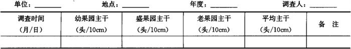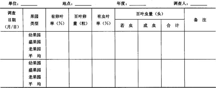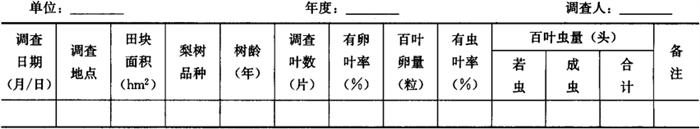 1.2.2 夏秋季调查 从春季系统调查结束时开始至梨木虱为害结束时止,一般在4月下旬至9月上旬,每5天调查1次。取每候的中间日,即每旬逢3、8日调查。在春季系统调查的梨树上继续调查,每株树按东、南、西、北、中各标定5个一年生短枝,共25枝。每个枝条调查基部、中部、梢部3张叶片。记载梨木虱卵、成虫、若虫数量。统计卵叶率、虫叶率,折算百叶卵量和百叶若虫、成虫量。调查卵量时用10倍以上放大镜分辨,重点调查叶片正面主脉沟内及幼嫩组织的茸毛间;调查若虫时叶片的反正面均要调查。将结果记入表7-47。 表7-47 夏秋季梨木虱系统调查记载表