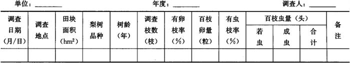 | 释义 | 梨木虱测报调查方法 梨木虱(Psylla chinensis Yang et Li)又叫中国梨木虱,属同翅目,木虱科。在我国除新疆外,各梨产区均有分布。尤以东北、华北、西北等北方梨区发生普遍。主要为害各种梨树。春季成、幼虫多集中于新梢、叶柄为害,夏、秋季则多在叶面吸食为害。受害叶片叶脉扭曲,皱缩,产生枯斑,并逐渐变黑,提早脱落。 1 调查方法与内容 1.1 越冬基数调查 于梨木虱越冬前,一般在9月中旬,选有代表性的幼果园、盛果期果园和老果园各两块,每块园面积在667m2以上,每块园在靠近边缘和中间部位各选1株梨树,每株梨树在距地面0.1~0.2m的主干上用10cm宽的透明胶带绕扎一周,一般绕2~3层,人为制造一个越冬场所。于12月下旬,调查藏在胶带下的梨木虱数量,作为越冬基数。记入表7-45。 表7-45 梨木虱越冬虫量调查表