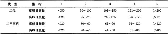 2 预测预报方法 2.1 世代划分及发生期确定 用3块系统调查梨园调查数据的平均值作为全年梨木虱的发生消长,5天1次的调查数据用“DPS数据处理软件”提供的插值处理校正成每天1次的数据。卵、若虫、成虫的消长曲线有明显始末期出现的,可直接确定世代的始末期;世代重叠时,以两代间数量低谷的中心点作为两世代的交界期。各代卵、若虫、成虫的始盛期、高峰期、盛末期,分别指当代累计卵量、若虫量、成虫量达到全代总累计卵量、若虫量、成虫量16%、50%、84%的日期。 2.2 发生量的表示及发生程度的划分标准 各代梨木虱的发生量用卵高峰日百枝(叶)卵量、高峰日百枝(叶)成、若虫量表示。发生程度以卵高峰日百枝(叶)卵量为一级指标,高峰日百枝(叶)虫量为二级指标划分成5级。分级标准见表7-50。全年发生程度等于各代发生程度的平均值。 2.3 发生期预测 春季梨木虱发生与物候密切相关。花芽萌动期即越冬代成虫出蛰盛期,花序分离期为一代卵盛期,花落80%为一代若虫盛期,结合系统调查和大田普查预报防治越冬代成虫、一代卵和一代若虫;夏、秋季梨木虱世代重叠,当田间以卵为主,若虫量开始上升时,如气象预报未来10天晴天少雨,即可根据卵量大小预报大面积防治。 2.4 发生程度预测 主要依据越冬基数、田间成虫量、卵量,结合气象预报,对发生程度综合做出预测。在干旱、少雨季节,梨木虱发生严重;湿度和降雨对梨木虱的影响较大,风雨冲刷是导致卵和低龄若虫死亡的关键因子。 3 发生程度划分标准(表7-50) 表7-50 梨木虱发生程度划分标准