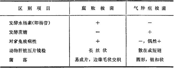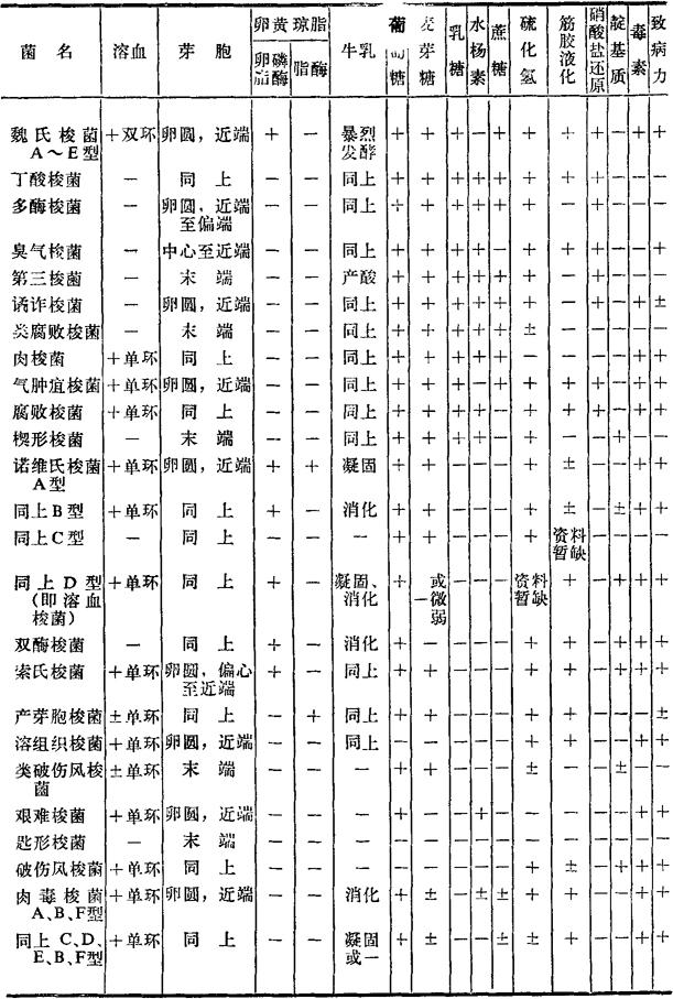 本菌在形态上与双酶梭菌相似,大小为3.5~4μm×1μm,芽孢位于中央或偏端,12~18h培养物革兰氏染色为强阳性,不运动或以周身鞭毛运动。菌落扩展成片,单个菌落为灰白色,半透明,芽孢形成后菌落不透明,菌落边缘不整齐,锯齿状或树根状,β溶血。 发酵葡萄糖、麦芽糖及甘油,不发酵甘露糖、山梨醇、水杨素、七叶甙、乳糖、蔗糖或甘露醇,尿素酶阳性,吲哚阳性,M.R.阳性,V.P.阴性,液化明胶或凝固的血清,部分消化凝固的卵蛋白并变黑,消化熟肉培养基中的肉渣并变黑,多数菌株产生卵磷脂酶,其作用能为A型魏氏梭菌的α抗毒素所中和。 有的菌株可产生毒素,其培养物上清液静脉或肌肉注射到天竺鼠能致死,皮内注射则产生紫褐色坏死。 为了以生化来协助区分兽医上重要的致病梭菌,下表供参考。