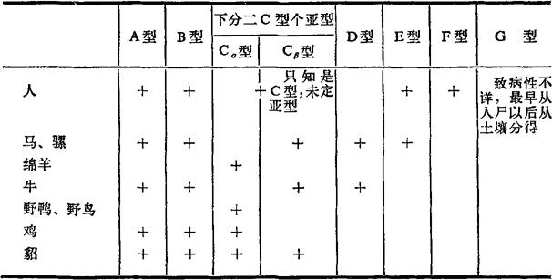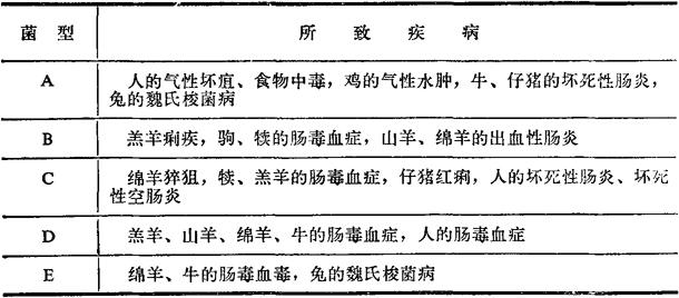 注:+表示能中和,一表示不能中和。 即A型抗毒素只能中和A型菌的毒素,B型菌的抗毒素能中和A、B、C、D型菌的毒素但不能中和E型菌的毒素……;竖行看,A型菌的毒素能为各型菌的抗毒素中和,B型菌的毒素只能为B型菌的抗毒素所中和,……。 魏氏梭菌致人及多种动物的疾病,可概括如下。 表17-3 魏氏梭菌各型所致疾病