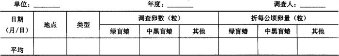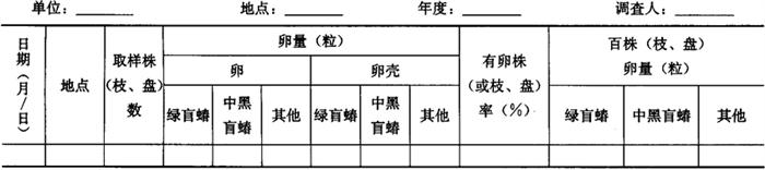 2.1.3.3 其他优势种类的棉盲蝽卵量,在进行上述两种盲蝽调查时,一并调查记载于表5-40。 2.2 各代卵量、虫量调查 2.2.1 第一代卵量调查 2.2.1.1 调查对象和时间 在冬前调查越冬基数的棉田,每种类型各取1块,于3月下旬、4月上旬分别采用淘土法检查1次。记载绿盲蝽、中黑盲蝽和其他优势种盲蝽的卵量。 2.2.1.2 调查取样方法 每块田采用5点取样法,每点取1/9m2表土(包括土表杂物)进行调查,然后折算每公顷卵量。结果记入表5-41。 表5-41 棉盲蝽一代田间卵量调查表