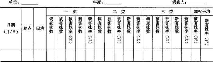 2.2.8 二至四代棉田虫量调查 选择当地各代所占面积最大棉田类型和易受害的棉田各1块,从6月10日开始,至9月底结束。采用5点取样法,二、三代每点查10株,共计50株;四代每点查5株,合计25株。5天调查1次。检查棉株嫩头、花蕾、幼铃上的成、若虫数。统计百株虫数及各龄虫所占百分比。记载表样式同表5-43。 2.2.9 二至四代棉田虫量普查 在各代主要优势种盲蝽二、三龄若虫高峰期,及大面积防治结束后,分别对大田进行普查,以验证预报的准确率和检查大面积防治效果。每次普查的田块数不少于10块,普查取样方法同系统调查。记载表样式同表5-43。 2.3 受害情况普查 2.3.1 嫩头受害普查 在二代二、三龄若虫高峰期,普查棉株嫩头受害情况。在一、二、三类田各查3块,分别记载新、老受害株,统计新、老受害株百分率,并记载当地一个自然村的各类型田的面积,将其加权平均。结果记入表5-46。 表5-46 嫩头受害情况普查表