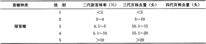4.2 发生量和发生程度预测 根据残留虫量和寄主作物面积、结合气象预报情况,参照历史资料,应用多种预测方法,做出发生程度预测。 5 发生程度分级标准 江苏省的绿盲蝽和中黑盲蝽发生程度和分级标准