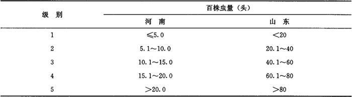 注:三、四代百株虫量均为二、三龄若虫高峰期百株虫量。 河南和山东省分别以棉盲蝽发生盛期平均百株虫量来划分。