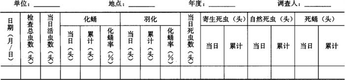 | 释义 | 棉红铃虫测报调查方法 棉红铃虫[Pectinophora gossypiella(Saunders)]属鳞翅目,麦蛾科。我国除新疆棉区以外,其他各棉区都有分布。以幼虫为害棉花蕾、花、铃、棉籽,引起落花、落蕾、落铃或烂铃、僵瓣。 1 主要影响因子 1.1 寄主植物 有8科77种,以棉花和羊角绿豆为主。我国在秋葵、红麻、蜀葵和木槿上均有发现。 1.2 温湿度 棉红铃虫发育的最适宜温度26~32℃,相对湿度在80%以上。-15℃是存活的低温界限。凡冬季任何一个月平均气温在-4.8℃以下的地区,在自然情况下,棉红铃虫不能存活过冬。 1.3 棉花的长势和食料 一代幼虫食害花蕾,往往1个蕾内只有1头幼虫存活。在自然条件下,取食蕾的幼虫成活率为10%~20%。二代幼虫蛀食青铃,每铃一般可存活3~4头幼虫。棉花长势好,现蕾早,一代为害重。迟发棉田,棉株后期长势旺,秋桃多,三代为害重。 1.4 气候 6~7月份降雨量偏多,偏低气温,棉花生长迟缓,现蕾开花期推迟,不利一代红铃虫发生为害。二代红铃虫产卵期,遇适量的降雨,产卵就多,为害加重。三代产卵期,如果阴天多,田间湿度大,产卵也多。但秋后气温下降到22℃以下,产卵量显着减少。 2 调查内容与方法 2.1 越冬幼虫化蛹、羽化和死亡观察 2.1.1 越冬幼虫采集 在上年棉花采收盛期,分3次从新收籽棉上按3∶4∶3的比例采集老熟幼虫共500~1000头,每试管装一头幼虫,并用洁净的棉絮塞紧,放在与棉仓条件相近的室内备查。 2.1.2 检查化蛹和羽化进度 当春季气温稳定通过12℃时开始进行检查,每2天检查1次,直至化蛹、羽化结束。结果记入表5-26。 化蛹率(或羽化率)=累计活蛹数(或羽化虫数)/检查当天的总活虫数×100%……(1) 越冬死亡率=(总虫数-总化蛹羽化虫数)/总虫数×100%……(2) 越冬调查结果记入表5-26。 表5-26 越冬幼虫化蛹、羽化进度调查表