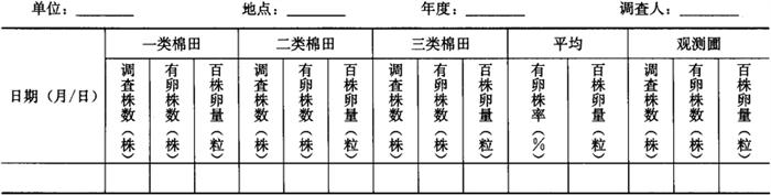 2.2 卵量调查 2.2.1 调查日期 从棉花现蕾开始调查,到9月底结束。 2.2.2 调查田块 根据对红铃虫产卵的适合程度,选择有代表性的一、二、三类棉田各1块,另设面积为300m2左右的不施药的一类棉田作为观测圃。 2.2.3 调查方法 每块田采用定点定株调查,5点取样,每5天调查1次。 2.2.3.1 一代卵量调查 每块田查50株,查清全株各部位的卵粒,查后将卵抹掉,计算有卵株率和百株卵量。 2.2.3.2 二、三代卵量调查 每块田查25株。二代查中、下部,三代查中、上部,及中、下部外围青铃上的卵粒(包括苞叶、萼片内侧等)。查时注意保持萼片的完整,查后将卵抹掉。同时,调查青铃总数(不包括吐絮和烂铃),计算有卵株率和百株卵量。每3~4天更换1次调查地点。新的调查点在开始调查前要先把以前的卵都抹掉。 2.2.4 大田卵量普查 在各世代卵始盛期和高峰期各调查1次。每块田随机取样,调查10株,统计百株卵量和百铃卵量,并和系统调查田比较,验证发生程度。每次普查田块应在10块以上。调查结果记入表5-27。 表5-27 红铃虫棉田卵量调查表