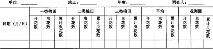 2.3 虫害花、羽化孔和单铃活虫数调查 在系统查卵的棉田内进行。 2.3.1 虫害花调查 每种类型田各定67m2,从棉花始花期开始,直至虫害花结束时为止。记载棉花株数,每天上午调查当日总开花数和虫害花数。以一、二代累计虫害花数、开花总数,计算一、二代花害率。结果记入表5-28。 表5-28 红铃虫虫害花调查表 单位:朵