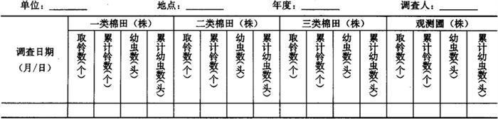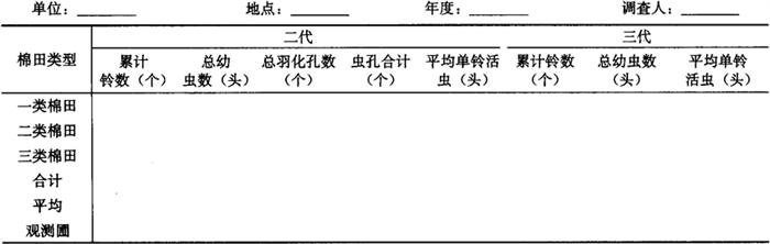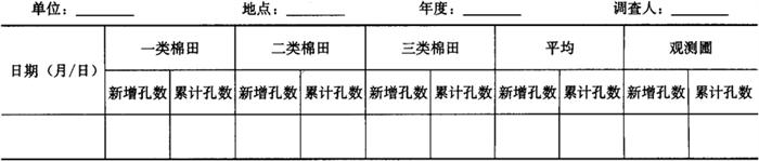 2.3.2 羽化孔调查 从出现青铃开始调查。每种类型田固定7m2,每2天调查1次。每次将查到的羽化孔做好标记。结果记入表5-29。 表5-29 红铃虫羽化孔调查表 单位:个