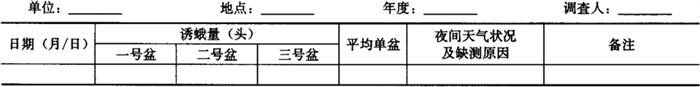 2.4 成虫诱集 采用全国统一规定的标准诱芯进行诱集。 2.4.1 诱集时间 长江上游棉区从5月上旬开始至9月下旬止,长江中、下游棉区5月下旬开始至10月上旬止。 2.4.2 性诱盆的设置 选连片棉田,设性诱盆3只,盆距30m,呈三角形排列。盆径为20cm,盆中保持2/3的水层,水中加入0.2%的洗衣粉,盆略高出棉株,盆面要用瓦片遮盖,防止阳光直射。30天更换1次诱芯。每天早晨捞蛾,无蛾或缺测均应记载。结果记入表5-33。 表5-33 红铃虫性诱剂田间诱蛾记载表