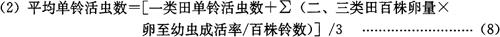 2.3.3 单铃活虫数调查 从棉田出现裂口铃开始至棉花吐絮结束为止。二、三代每种类型田各固定7m2,3天采收1次裂口铃。记载铃数、活虫数、枯铃数、枯铃含虫量,统计单铃活虫数(包括单铃累计羽化孔数)。按调查总铃数、总虫量、籽棉重量,计算单铃活虫数、0.5kg籽棉含虫量和平均公顷总虫量等。结果记入表5-30、5-31、5-32。平均单铃活虫数按下式计算: 平均单铃活虫数=(总幼虫数+总羽化孔数)/全代累计铃数……(3) 表5-30 红铃虫棉田单铃活虫数统计表