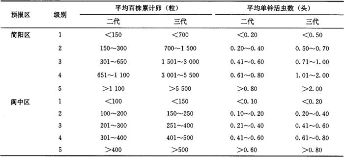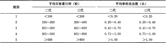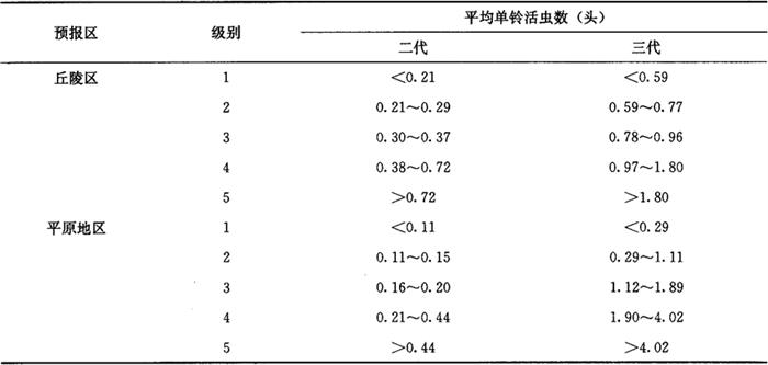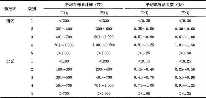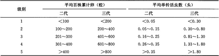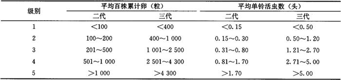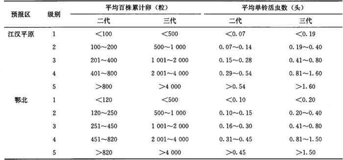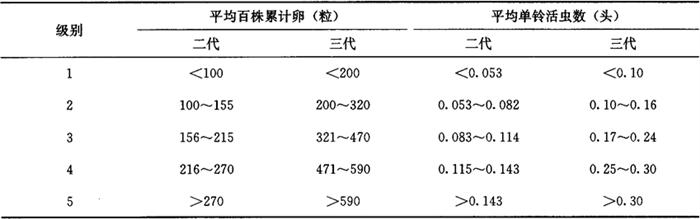 33.2 皮棉产量损失率(即若不防治时,所造成的皮棉产量损失率) 用本地实验建立的产量损失计算模型,本地未建立产量损失计算模型,可参照发生情况相似地区的产量损失计算模型进行。 3.3.3 统计防治后皮棉产量、产值损失率(即实际造成的皮棉产量、产值损失率)将大田调查获得的平均单铃活虫数代入皮棉产量、产值损失模型求得。 3.3.4 统计防治挽回皮棉产值、产量损失率 防治挽回皮棉产值(产量)损失率=不防治皮棉产值(产量)损失率-防治后皮棉产值(产量)损失率……(9) 3.4 红铃虫的年发生程度 Lz=∑L2Q2L3Q3 式中: Lz——全年皮棉产值损失率(%); L2——二代皮棉产值损失率(%); L3——三代皮棉产值损失率(%); Q2——二代为害期产值占全年总产值比值; Q3——三代为害期产值占全年总产值比值。 3.5 红铃虫调查资料表册 全国制订统一的调查资料表册,各项调查内容在调查结束时,须认真统计和填写。增加预报区内红铃虫发生防治基本情况表,以便全面分析红铃虫的发生影响因素。发生程度、为害损失情况,按历年测报资料的统计汇总方法统计和填写。 3.6 红铃虫测报资料统计(汇总)表册 全国制订统一的统计(汇总)表册。可在调查资料的基础上,把有关项目按测报资料统计(汇总)方法,整理成预测预报需要的数据,从而为建立测报资料数据库奠定基础。 4 预测预报方法 4.1 预报第二年棉红铃虫发生趋势 通过预测,可以对第二年棉红铃虫的发生防治情况做好准备。方法是根据近几年测报调查资料和气象预报,应用对比法进行预报。 4.2 预报第二代棉红铃虫发生期和发生程度 4.2.1 预报第二代棉红铃虫卵高峰期 应用一代卵高峰与虫害花高峰期分别和二代卵高峰期的期距等方法,可以预测出二代卵高峰期。 4.2.2 预报第二代棉红铃虫发生程度 根据所调查的每67m2棉田虫害花数量、虫害花率,结合第二代红铃虫发生期气象预报情况,应用多种预报方法(方法举例详见棉铃虫)做出预报。 4.3 预报第三代棉红铃虫发生期和发生程度 由于第三代棉红铃虫的虫源在一些棉区比较复杂,一部分来自青铃,一部分来自虫害花,年度之间分布比例有变化。因此,各地区选取预测因子,有所不同。 4.3.1 预报第三代棉红铃虫卵高峰期 对全部虫源来自青铃的地区,可以分别根据二代卵高峰、青铃羽化孔高峰和三代卵高峰的期距,做出预测。也可以应用其他预测方法,进行预测。对来自青铃和虫害花的地区,可以根据两者各自和三代卵高峰的期距,做出预测。也可以应用其他预测方法进行预测。 4.3.2 预报第三代棉红铃虫发生程度 根据所调查的每67m2棉田虫害花数量、虫害花率、青铃羽化孔数量,晚发迟熟棉田的面积比率,结合第三代红铃虫发生期气象预报情况,应用多种预报方法做出预报。 5 发生程度分级标准 5.1 江苏省