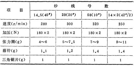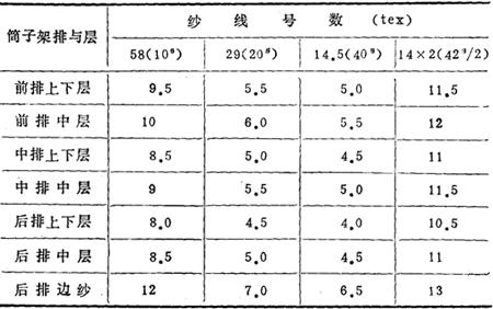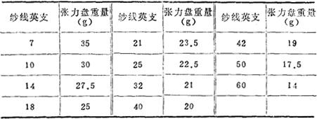 式中k为系数,40号筘以上取0.96,40号以下为0.93。 (五)卷纬(以SG193型为例) 1)张力配置参考数据(表18-185) 表18-185 不同纱支卷纬张力参考数据