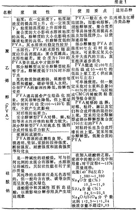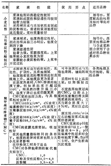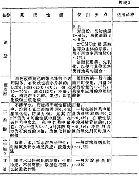 常见的粘着剂、助剂的浆液性能、使用要点见表18-175。 表18-175 粘着剂、助剂性能及使用要点