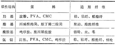 2)浆料选配依据 合理的浆料配方,必须符合上浆、织造及印染的各种工艺要求,应使调浆及上浆工艺顺利地进行,织造断头少,效率高、成布品质良好,印染加工时易退浆及无损于布质和降低浆料消耗及浆料成本。 通常确定工艺配方时,要根据纤维种类、经纱号数、织物结构等特点,结合浆料来源合理配用粘着剂和助剂。 (1)纤维种类 经纱的纤维种类与粘着剂的相溶亲和性,在选用浆料时是非常重要的因素。两种物质具有相同结构的基团时,它们能相互溶解,并且彼此之间的亲和力很大。浆料和适用纤维见表18-176。 表18-176 浆料和适用纤维