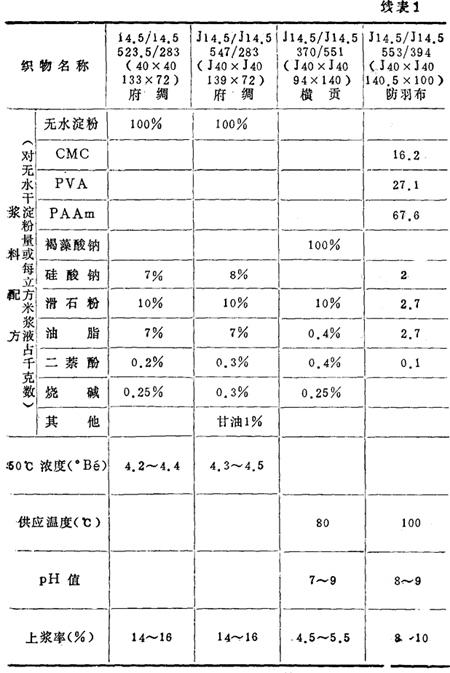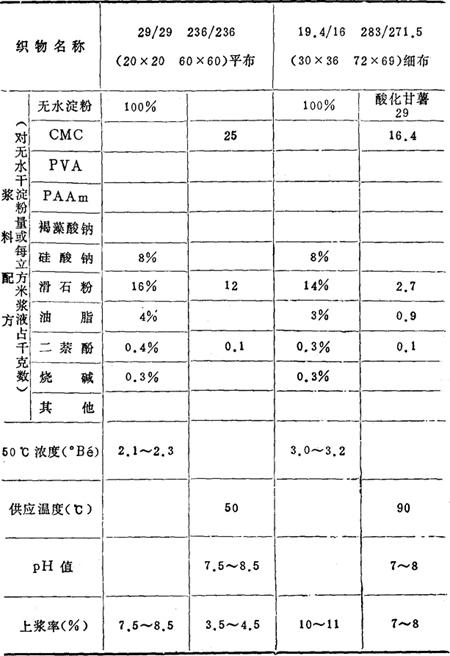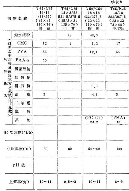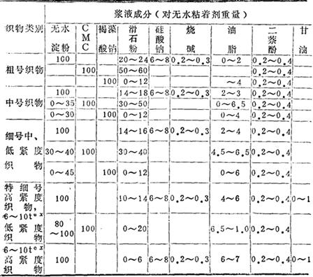 此外,根据不同的具体情况,使用适当的助剂。如淀粉浆配用分解剂、减摩剂、柔软剂、防腐剂;丙烯酸系浆本身很软,无需加柔软剂,而应配用减摩剂;合成浆料可少用防腐剂;动物胶应加防腐剂和柔软剂;碱性浆和褐藻酸钠浆应采用消泡剂。再如,合成纤维的吸湿性差,容易摩擦带电,应当使用吸湿剂和抗静电剂;蜡质多的棉纤维适当加一点乳化剂和浸透剂。 (2)经纱号数与品质 细号经纱,所用原料较佳,弹性和断裂伸长率较大,毛羽也少,但强度较低。故上浆时增强要求较高,上浆率应较高,浆液应有较好的浸透性、粘附性,被覆少些,减摩剂量可减少,适当增加柔软剂。反之,纱线愈粗,上浆时自要求重于被覆,上浆率可较低,多用些减摩剂,柔软剂可少用或不用。捻度大的纱线,因吸浆较差,上浆时应采用流动性较好的浆液,应加浸透剂,对淀粉浆宜多加分解剂。 (3)织物结构 织物组织不同,织造时单位长度经纱所受摩擦次数也就不同;同样情况下,平纹比斜纹次数多,因此平纹上浆率应比斜纹的大。同样道理,同是平纹织物、府绸的应比一般平布高。 对于其它品种织物,在选择浆料时,也可根据其结构特性,参照上述要求进行。 3)浆液配方参考实例 (1)淀粉、褐藻酸钠、CMC浆配方范围(表18-177) 表18-177 定粉、褐藻酸钠、CMC浆配方范围