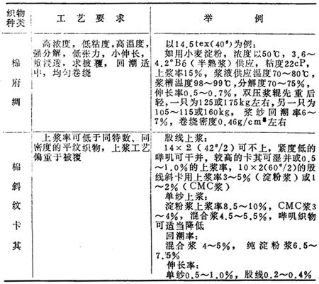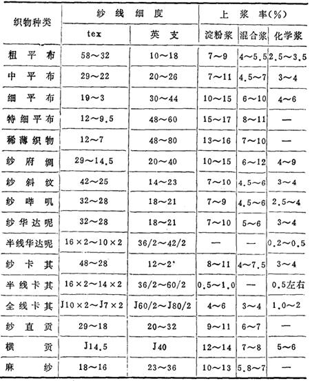 主要棉织物在使用不同浆料时的上浆率参考范围见表18-179。 表18-179 各种棉织物使用不同浆料上浆率参考范围