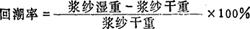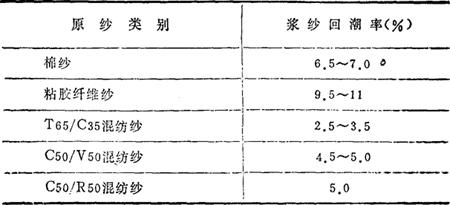注:①纯淀粉浆指用100%的玉米淀粉、小麦淀粉等。 ②化学浆指用100%的CMC,PVA等。 ③混合浆指用CMC等分别与淀粉按不同百分比混合使用。 (2)回潮率