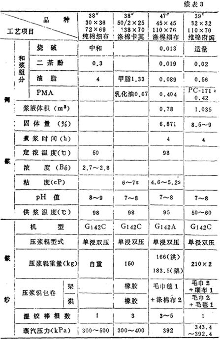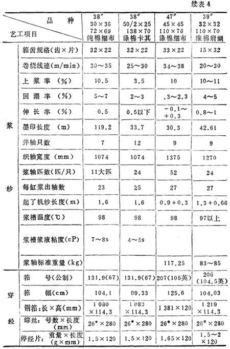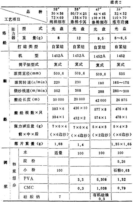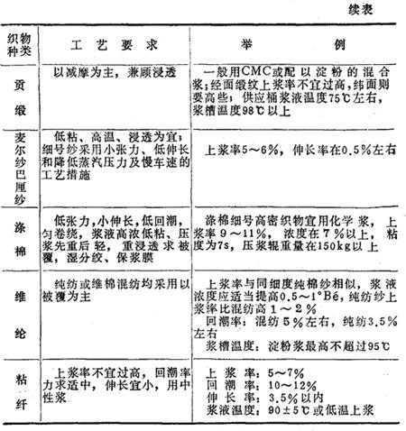 2)浆纱工艺配置 各类织物上浆工艺配置要求见表18-183。 表18-183 几种织物上浆工艺要求及举例