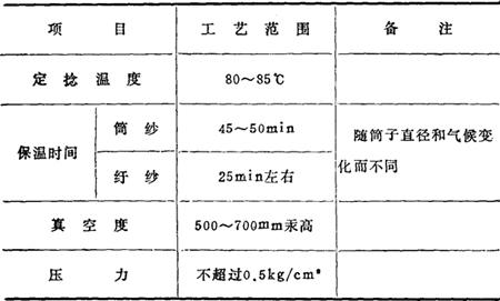 (六)热湿定捻 纬纱加热定捻有高温和低温两种。加热定捻高温一般为80~90℃,定捻时间可短些;加热定捻低温一般为40~60℃,定捻时间可长些。筒子直径大,卷绕密度大时,热定捻时间应长些;反之,可短些。纡管纱直接加热定捻时间可更短些。 表18-187为涤棉65/35混纺纱定捻工艺。 表18-187 涤棉65/35混纺纱定捻工艺