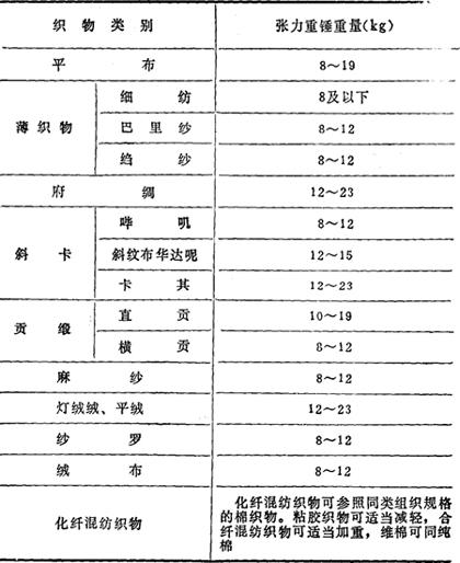 (七)织造 1.工艺设计原则 (1)改善织物的物理机械性能。 (2)提高织物的外观效应,体现织物的风格特征。 (3)减少织疵,提高下机质量。 (4)减少纱线断头,提高生产效率。 (5)降低消耗。 2.工艺参数配置 1)经纱上机张力 张力重锤配置参考数据(表18-188)。 表18-188 各类织物张力重锤配置参考数据