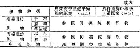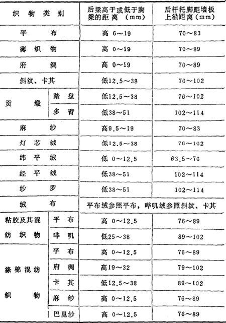 2)经位置线 经位置线的尺寸在梭口前部基本固定不变。边撑杆(L44)通常低于胸梁表面水平6.5mm,边撑盒倾斜角9°左右。织口点高于走梭板表面22mm。后梁高低参考数据见表18-189。 表18-189 各类织物后梁高低参考数据