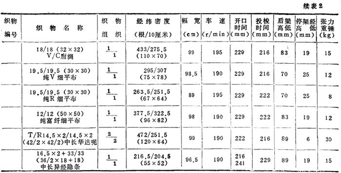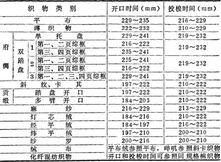 3)开口与投梭 各类织物开口与投梭时间配置参考数据(表18-190)。 表18-190 各类织物开口与投梭时间