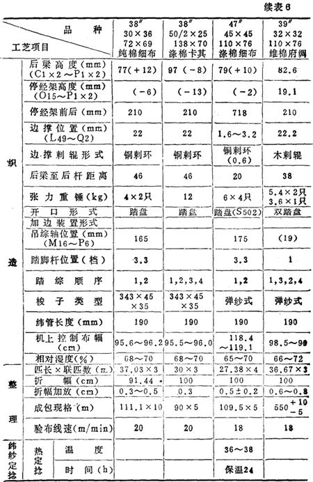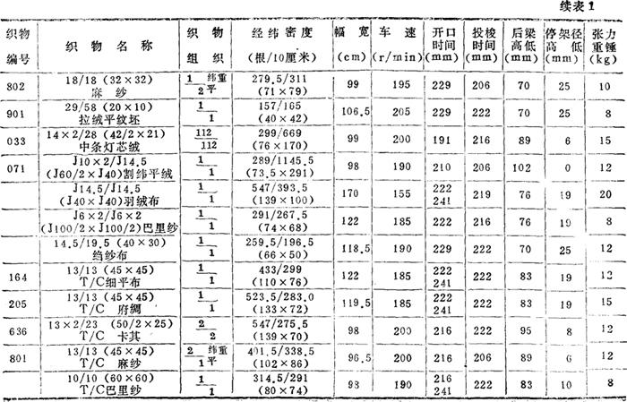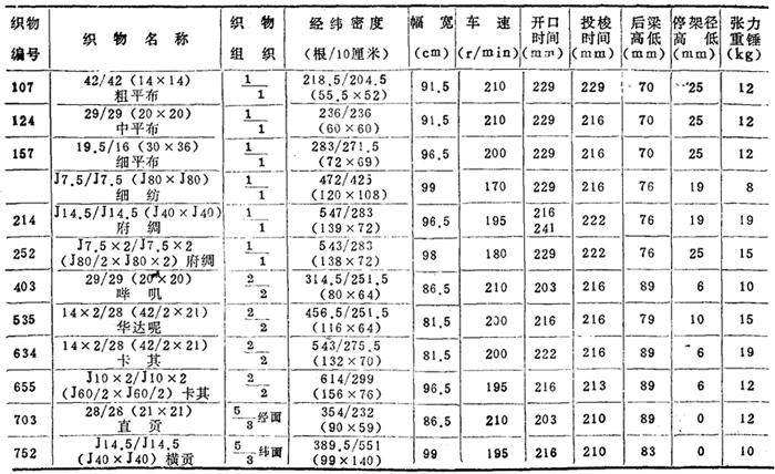 其中a%为下机缩率(一般细纺布1%左右,细平布、哗叽2%左右,粗平布、府绸、卡其织物3%左右,灯芯绒、平绒4%左右)。 3.各类织物织机工艺参数示例(表18-191)。 表18-191 各类织物织机工艺参数